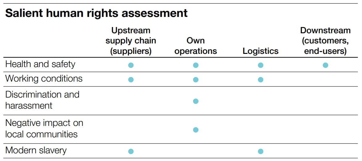 We understand that identifying salient human rights issues is an ongoing process. While undertaking due diligence on the salient human rights issues, we continue to analyze and monitor our potential impacts on human rights across our value chain while paying extra attention to vulnerable groups. We value the engagement with both internal and external stakeholders, such as employees, human rights experts, NGOs and society at large, as being key in these processes. Frank and open dialog with all our stakeholders enables us to go further and faster than we could alone.